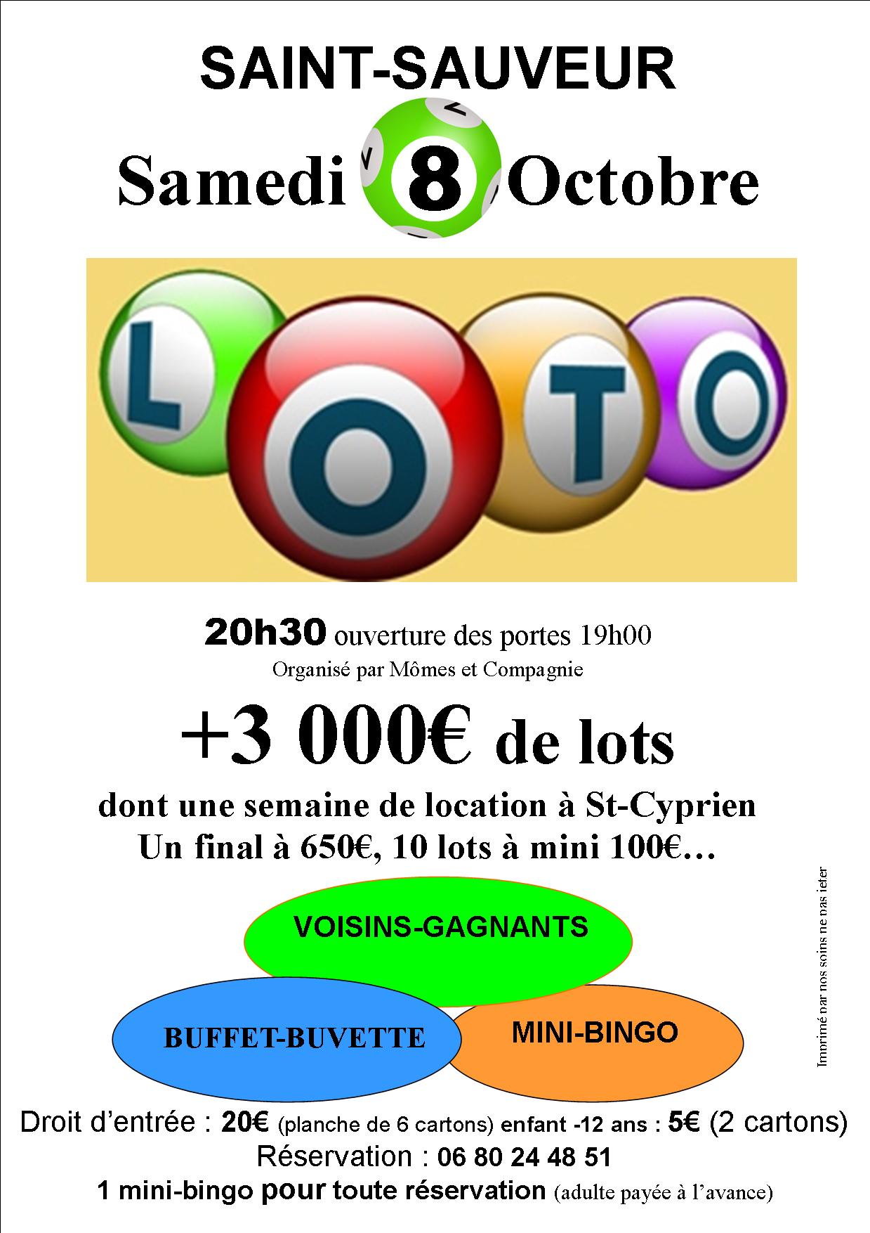 Pour la première animation de l’année elle vous propose un loto le Samedi 8 octobre à 20H30 à la salle polyvalente de Saint-Sauveur.
