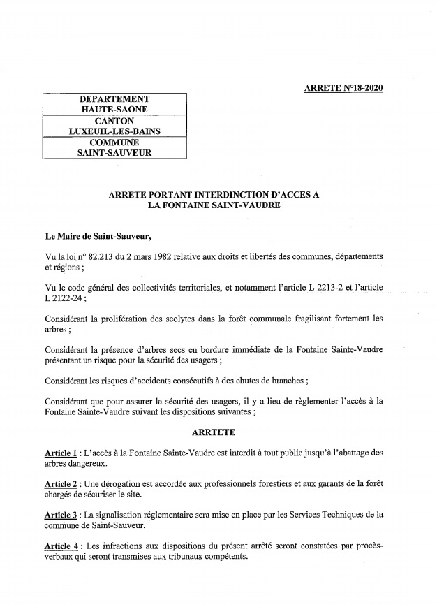 En raison de la prolifération des scolytes dans la forêt communale fragilisant les arbres et pouvant provoquer la chute de branches, l’accès à la Fontaine Sainte-Vaudre est temporairement interdit.