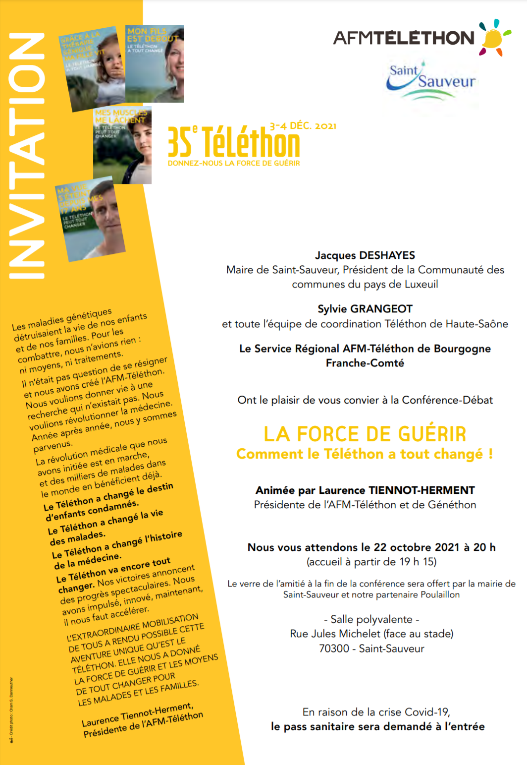 Cette année nous aurons en plus le plaisir d’accueillir une conférence en présence de la présidente de l’AFM Téléthon, Mme Laurence Tiennot-Herment.