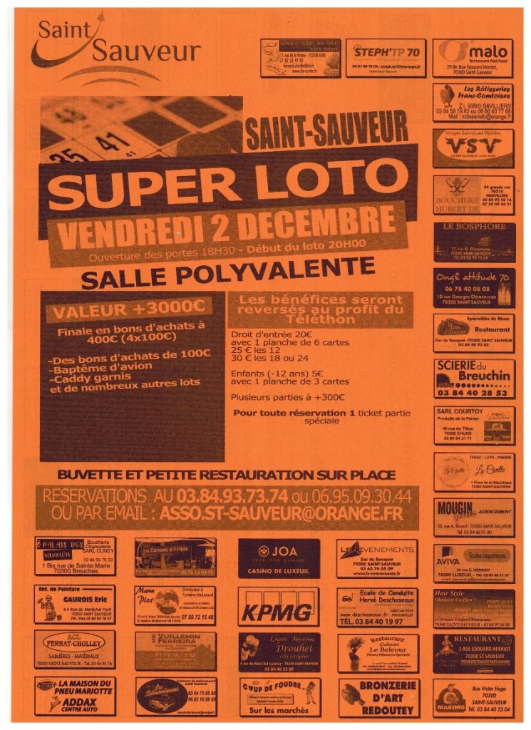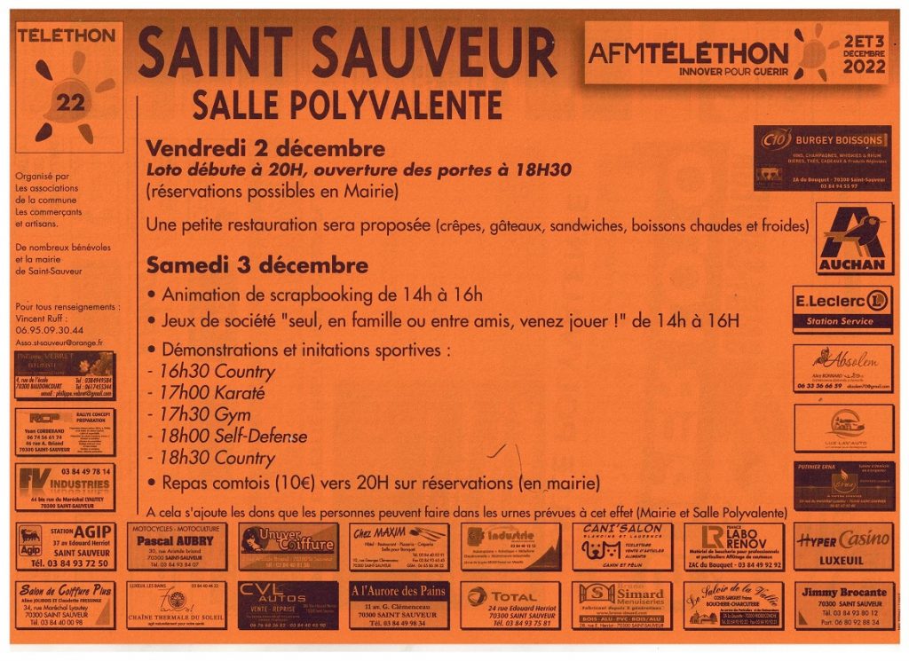 Le Téléthon de Saint-Sauveur c’est le week-end du 02/03 décembre. C’est un loto le vendredi soir (inscriptions en Mairie) mais aussi un repas le samedi soir après des démonstrations sportives et un après-midi ludique en famille (jeux et scrapbooking)