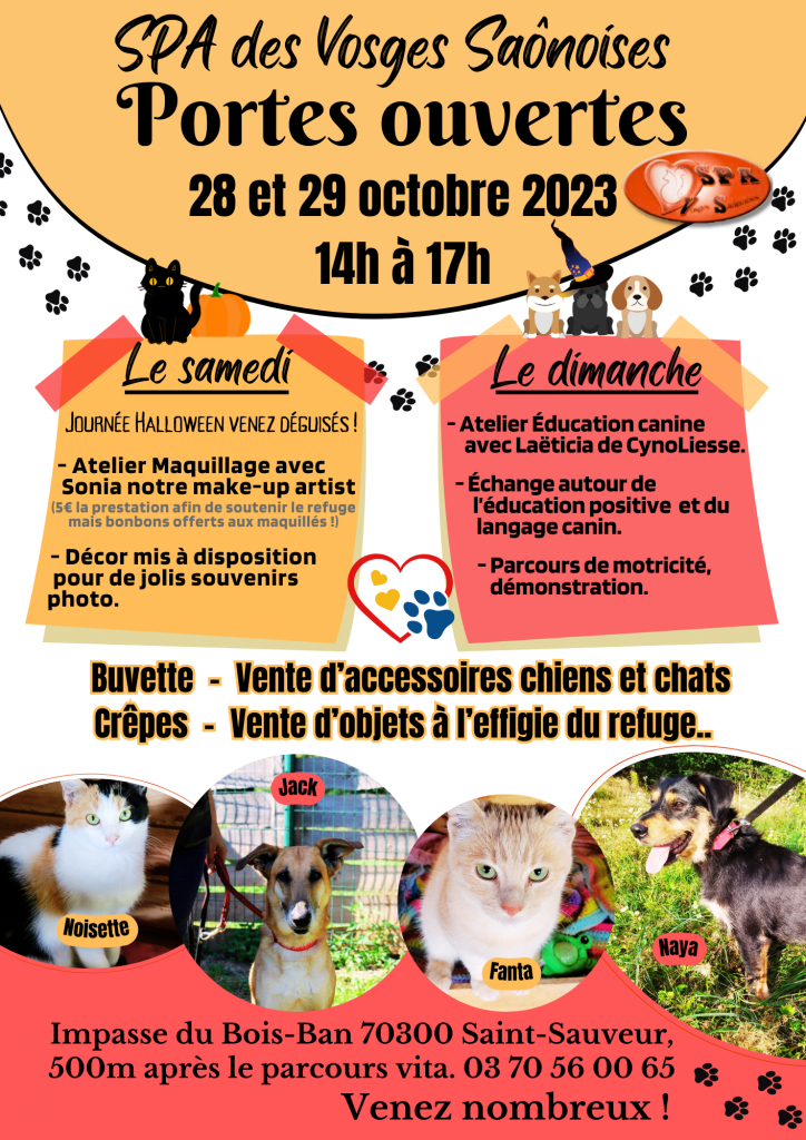 La SPA des Vosges Saônoises organise des journées portes ouvertes le 28 et le 29 octobre de 14H à 17H.