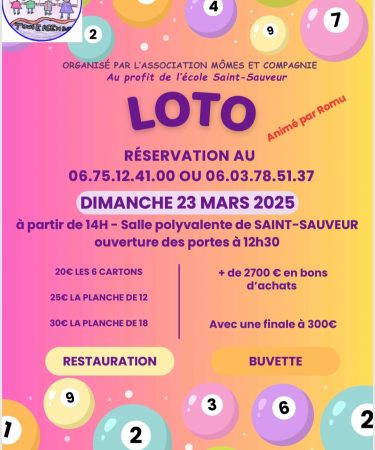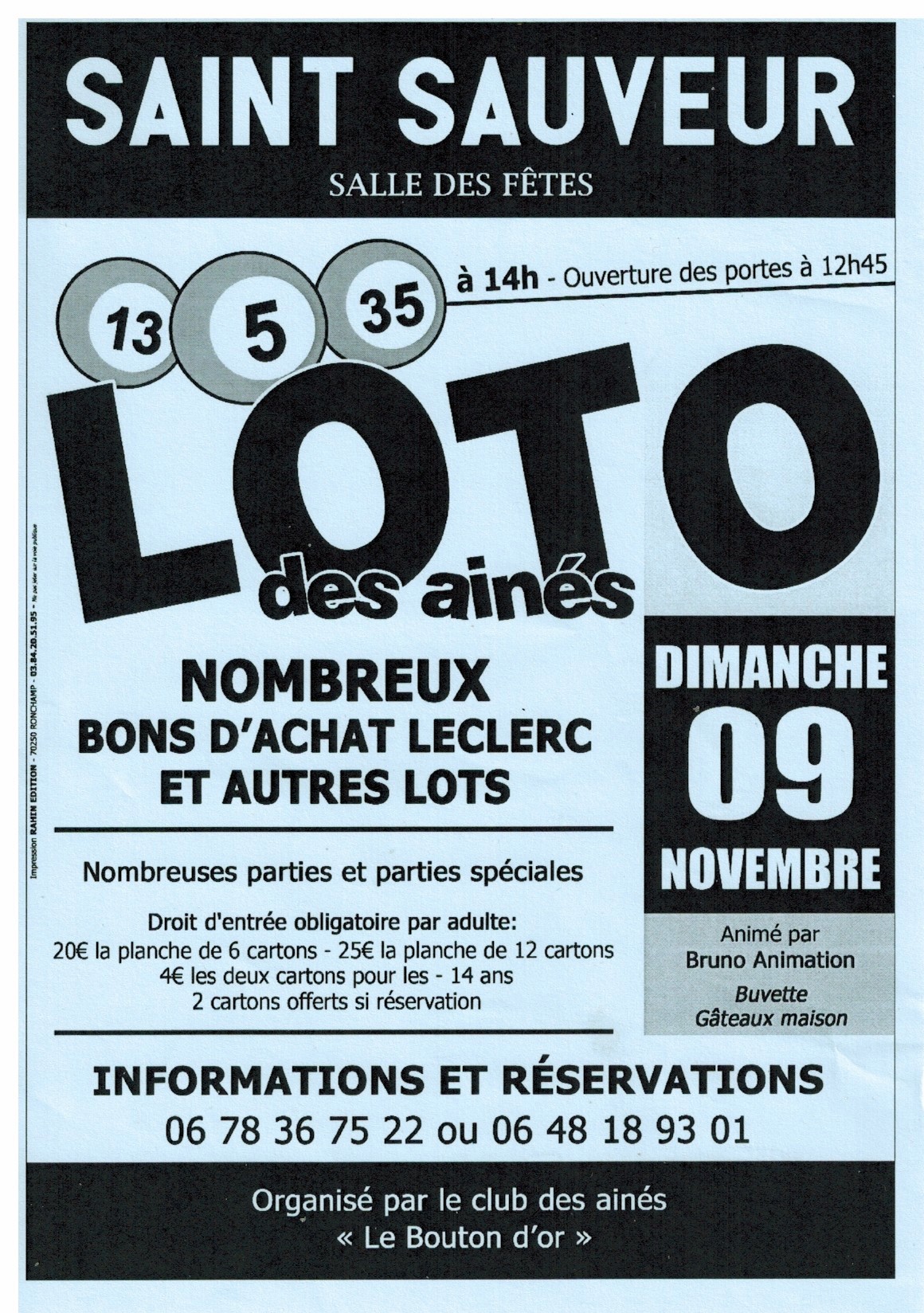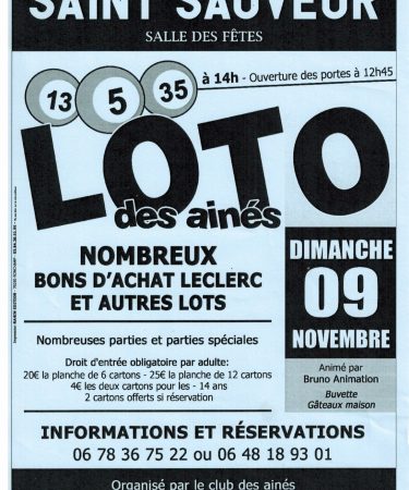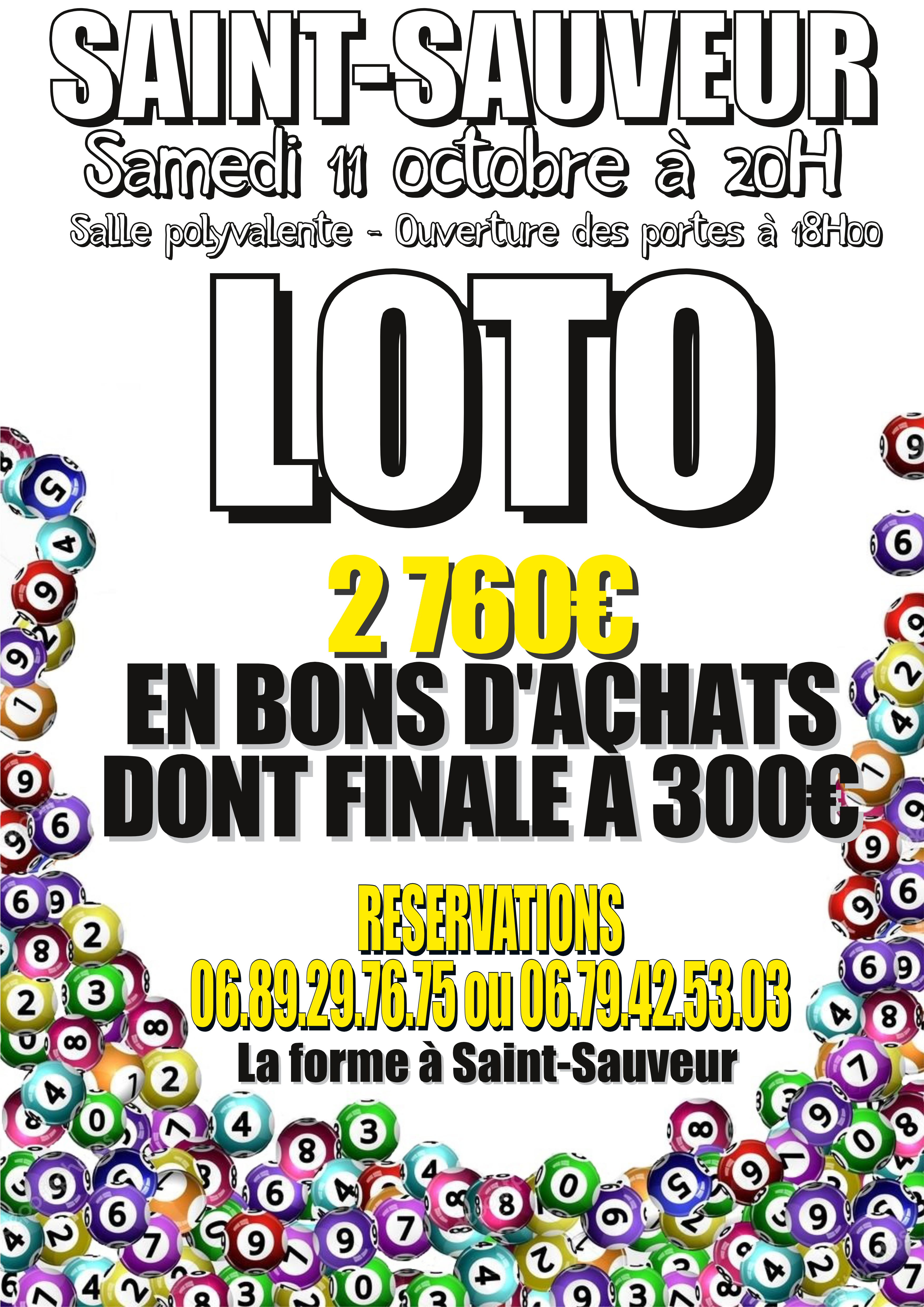 L’association « La Forme à Saint-Sauveur » organise son loto le samedi 11 octobre à 20H dans la salle polyvalente de Saint-Sauveur. Renseignements et inscriptions au 06.89.29.76.75 ou 06.79.42.53.03