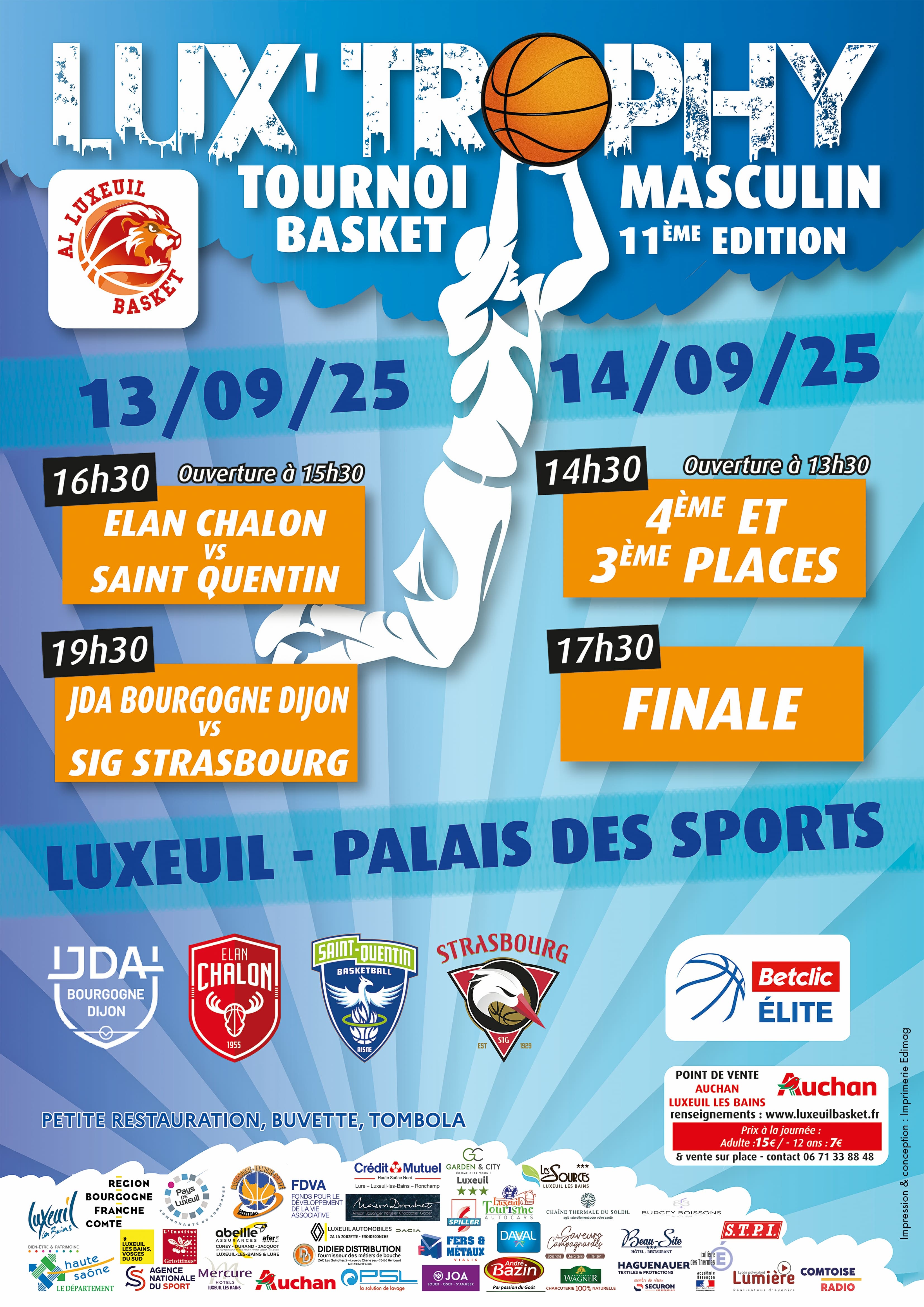 L’Amicale laïque Luxeuil-Saint-Sauveur Basket organise la 11ème édition du tournoi masculin LUX’TROPHY qui se déroulera les 13 et 14 septembre 2025 au Palais des sports de Luxeuil les Bains, suivie de la 3ème édition du tournoi international féminin LUX’ELLETROPHY les 20 et 21 septembre.