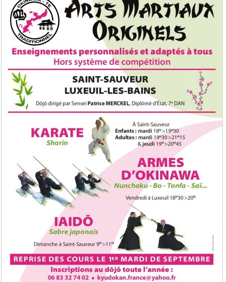 Okinawa te traditionnel dôjô va va reprendre le chemin de ses entraînements officiels, même si ceux ci n’ont jamais cessés durant les congés.Seule association régionale à proposer trois activités martiales : karatedô shorin kyudokan, kobudô d’okinawa et iaidô, elle est dotées d’un noyau d’encadrement important :– Deux diplômes d’état, trois DAF, trois DIF, un diplôme …