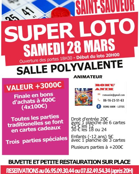 Loto organisé par Loisirs et Culture sur Saint-Sauveur. Toutes les parties classiques sont en bons d’achats. Finale à 400€ Trois parties spéciales Ouverture des portes à 18H30 Droit d’entrée 20€ pour 1 planche de 6 cartes25€ les 1230€ les 18/24 Buvette et petite restauration sur place.