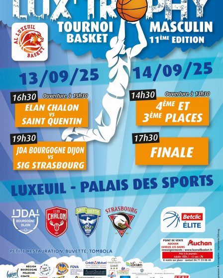 L’Amicale laïque Luxeuil-Saint-Sauveur Basket organise la 11ème édition du tournoi masculin LUX’TROPHY qui se déroulera les 13 et 14 septembre 2025 au Palais des sports de Luxeuil les Bains, suivie de la 3ème édition du tournoi international féminin LUX’ELLETROPHY les 20 et 21 septembre.