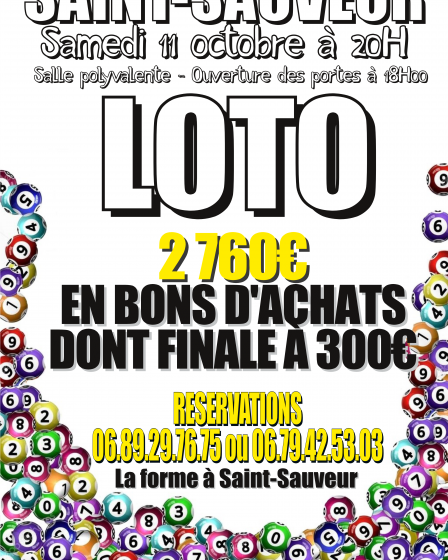 L’association « La Forme à Saint-Sauveur » organise son loto le samedi 11 octobre à 20H dans la salle polyvalente de Saint-Sauveur. Renseignements et inscriptions au 06.89.29.76.75 ou 06.79.42.53.03