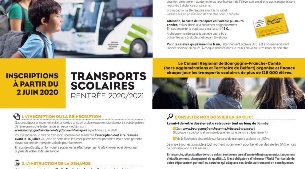 La Région Bourgogne-Franche-Comté vous informe que le site d’inscription aux transports scolaires pour l’année 2023/2024 ouvrira le 5 juin 2023. Que ce soit pour une première demande ou un renouvellement, les familles, qui souhaitent que leur(s) enfant(s) emprunte(nt) les transports scolaires, ont l’obligation de procéder à leur(s) inscription(s). Afin de faciliter l’accès aux transports scolaires …