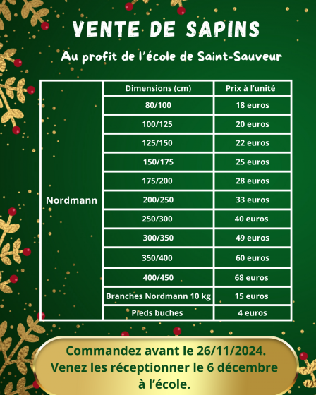 L’école de Saint-Sauveur propose une vente de sapins pour les fêtes de fin d’année. Vous pouvez commander votre sapin au 06.02.17.32.49 ou en vous rendant directement à l’école. Règlement en espèces ou en chèque (à l’ordre de l’OCCE école de Saint-Sauveur) Cette vente est importante pour l’école car elle contribue au financement des sorties scolaires …
