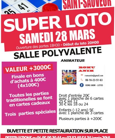Loto de l’association Mômes et Compagnie au profit de l’école de Saint-Sauveur. C’est le 7 février à la salle polyvalente.
