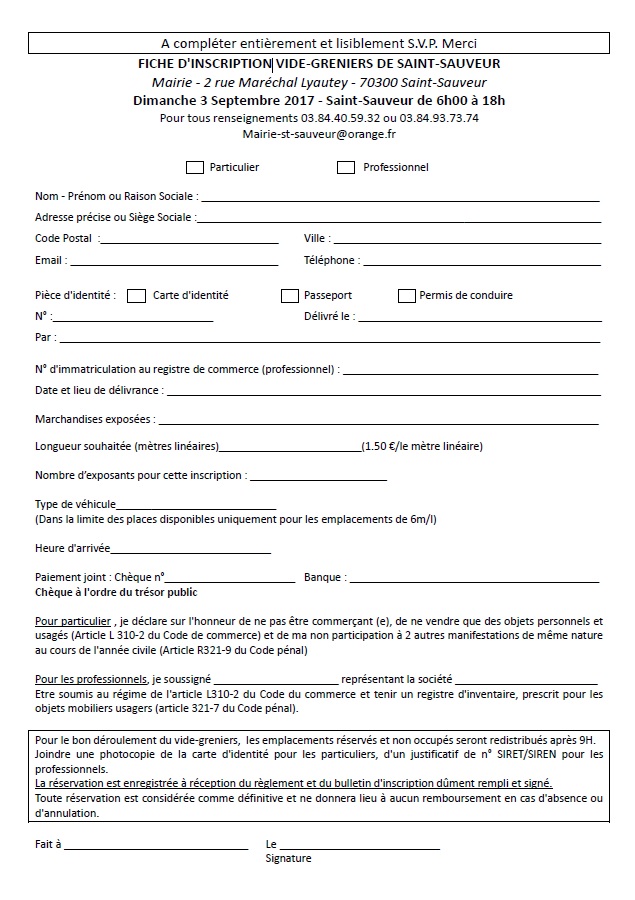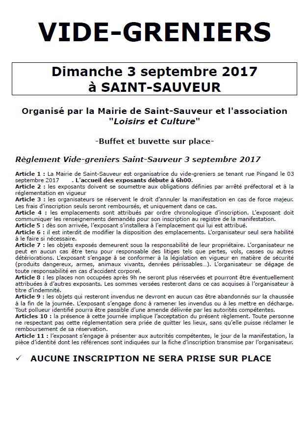 La Mairie de Saint-Sauveur avec l’association « Loisirs et Culture » organise comme tous les ans son Vide-greniers dans le parc de l’école le dimanche 3 septembre.
