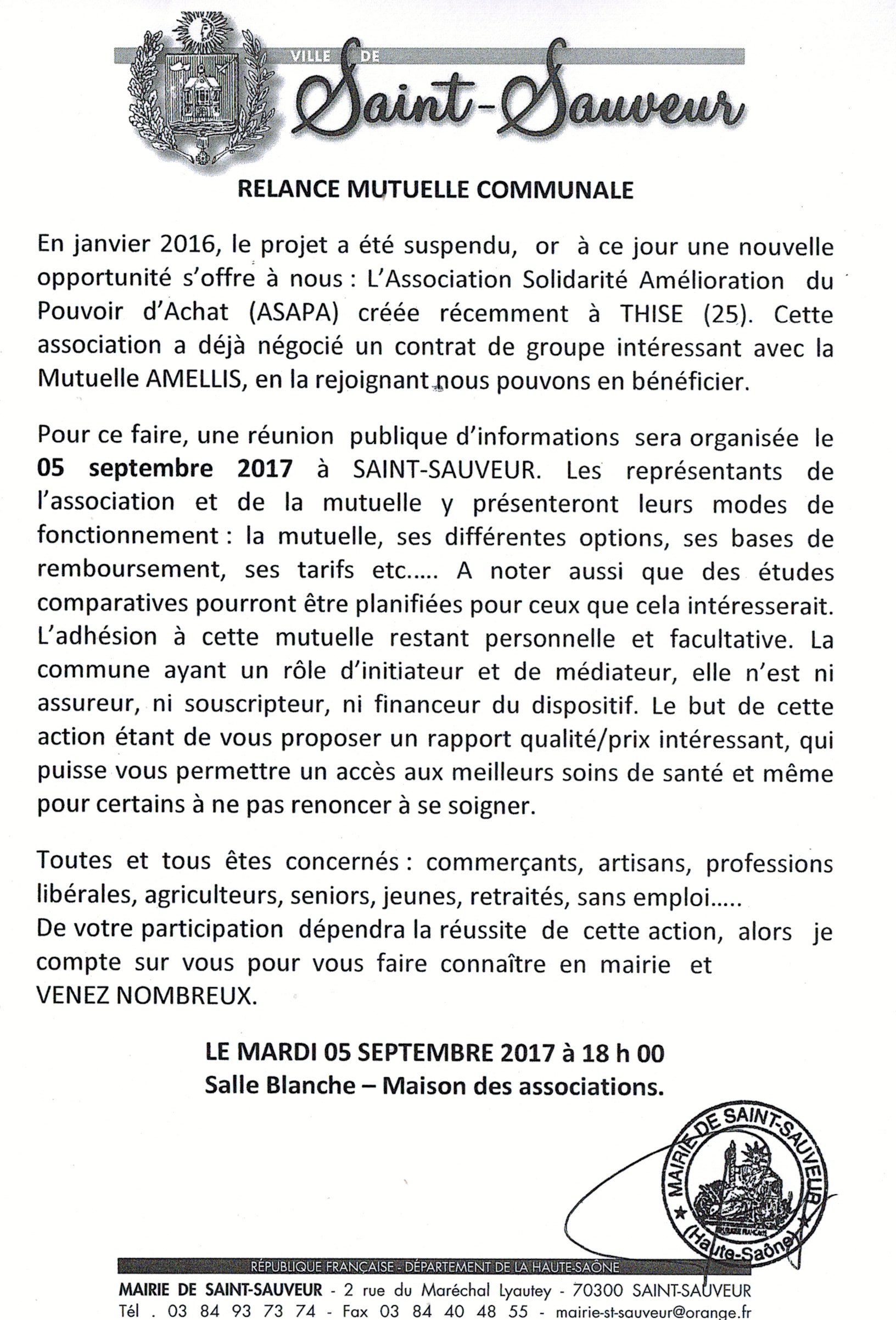 par Vincent Ruff29 août 201729 août 2017 Une réunion d’information pour la mise en place d’une mutuelle communale aura lieu le mardi 05 septembre à 18H00 à la Maison des Associations.