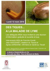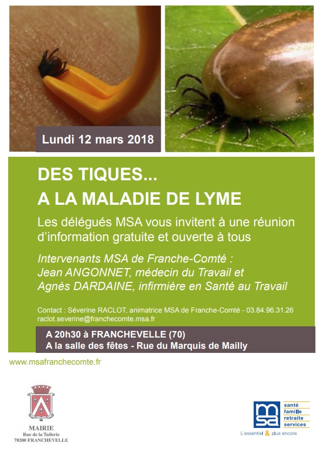 par Vincent Ruff7 mars 20187 mars 2018 Les délégués MSA vous invitent à une réunion d’information sur la maladie de Lyme, qui aura lieu le Lundi 12 mars à 20h30 à la salle des fêtes de Franchevelle. Réunion et débats animés par le Dr Jean Angonnet et par Mmme Agnès Dardaine infirmière. Entrée gratuite sans réservation préalable.