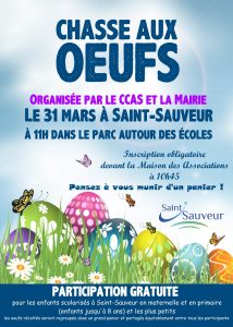 C’est bientôt Pâques (le 1er Avril !), c’est pourquoi la Mairie et le CCAS organisent une « chasse aux œufs » le 31 Mars à Saint-Sauveur (dans le parc de l’école), pour les enfants scolarisés à Saint-Sauveur (jusqu’à 8 ans) et les plus petits.