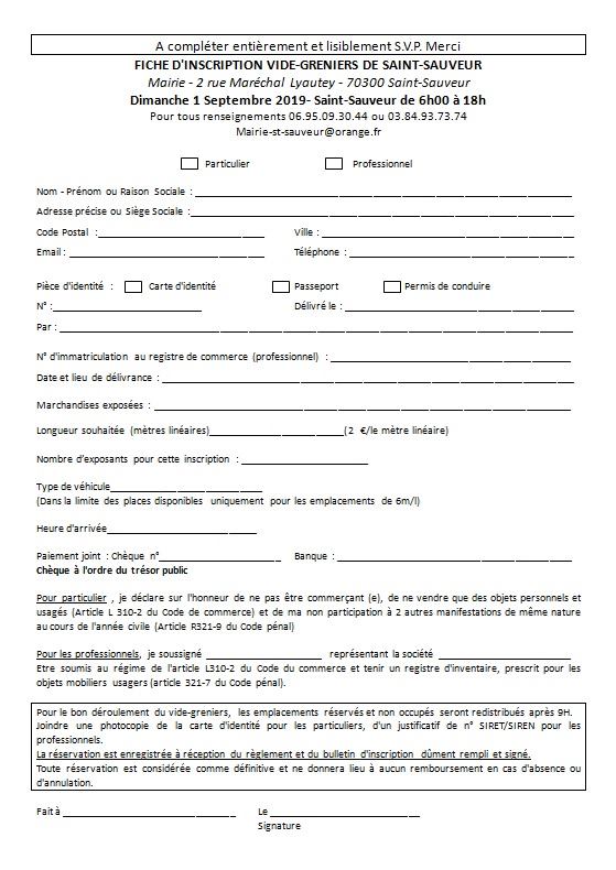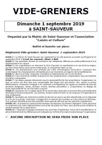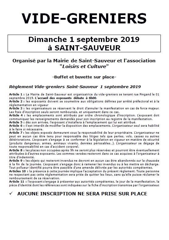 Nous vous rappelons que la Mairie de Saint-Sauveur avec l’association « Loisirs et Culture » organise comme tous les ans son Vide-greniers dans le parc de l’école le dimanche 1 septembre.