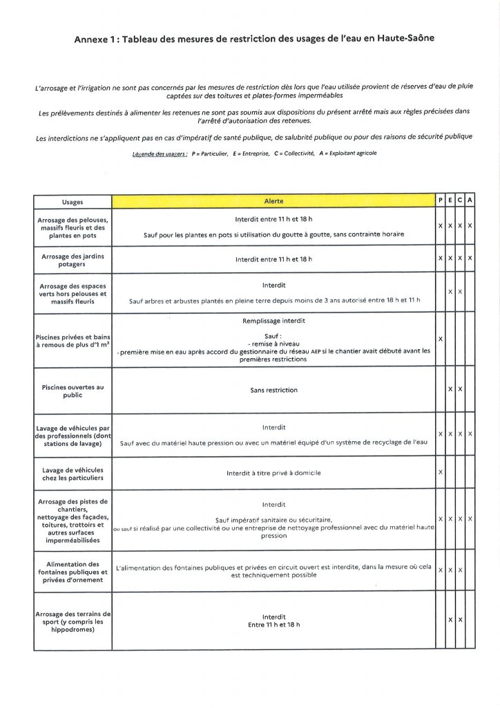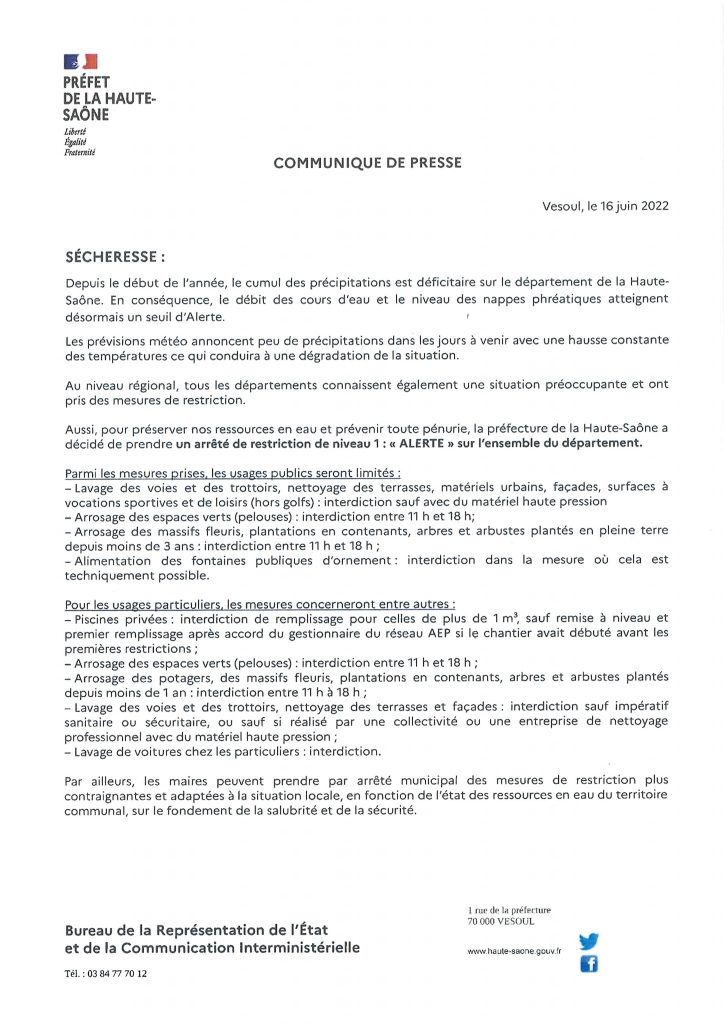 En raison des conditions climatiques et hydrologies la préfecture vient de réduire les usages de l’eau à partir du samedi 18 juin 2022.