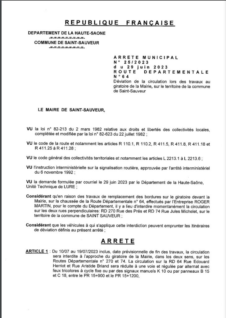 Des travaux vont être réalisés du 10 au 19/07 sur le rond point de la Mairie par le département. En raison de ces travaux la circulation va être perturbée sur le secteur et des déviations mises en place.