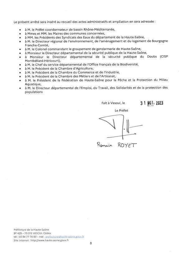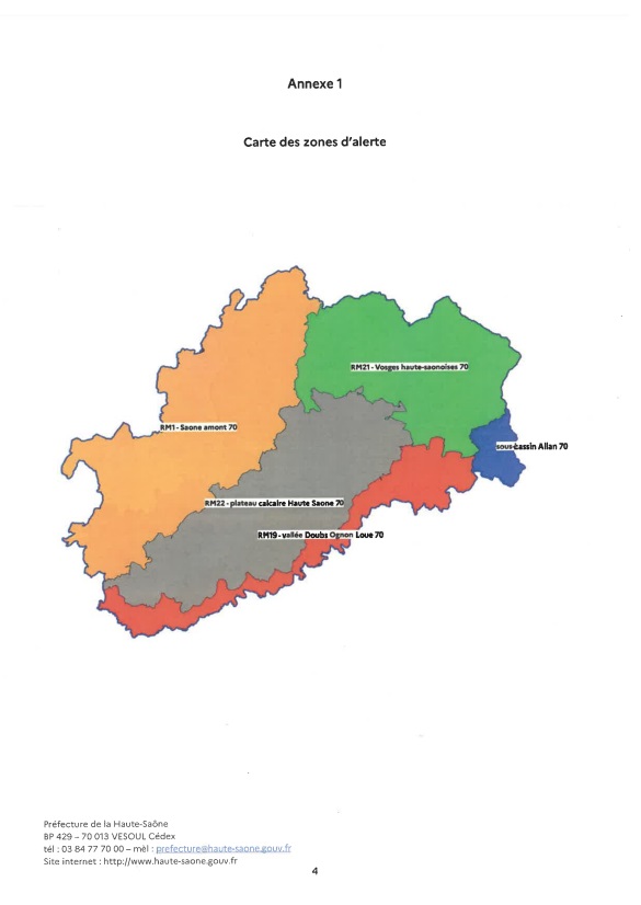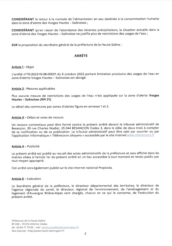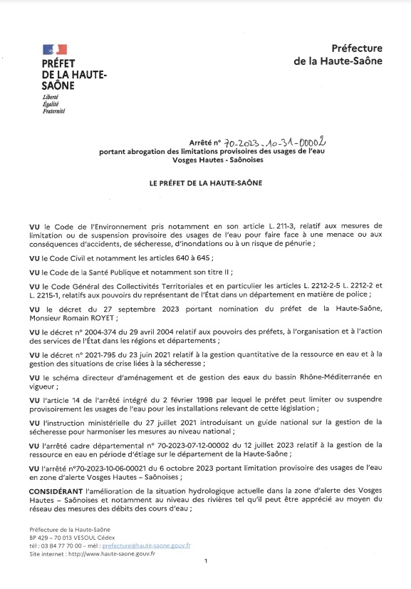 Considérant le retour à la normale de l’alimentation en eau destinée à la consommation humaine dans la zone d’alerte des Vosges Hautes-Saônoises.