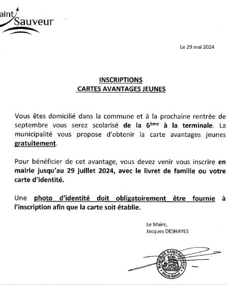 Pour cette année la municipalité offre à nouveau la carte avantages jeunes aux salvatoriens scolarisés de la 6ème à la terminale. Inscription en Mairie avant le 29 juillet.