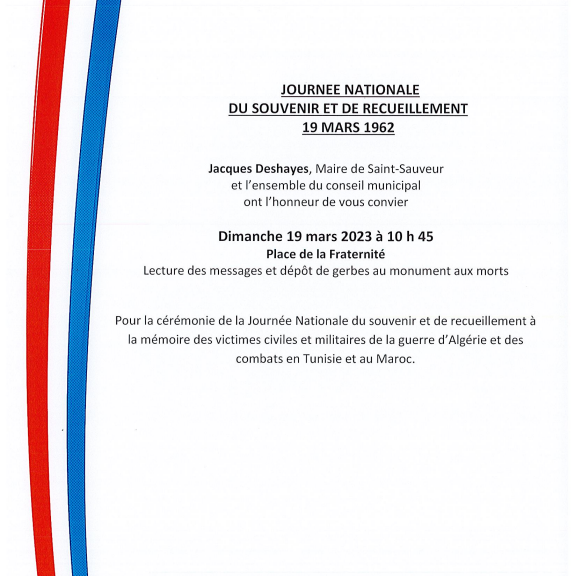 Cérémonie du 19 mars, journée nationale du souvenir et de recueillement à la mémoire des victimes civiles et militaires de la guerre d’Algérie et des combats en Tunisie et au Maroc, se déroulera place de la fraternité le Dimanche 19 à 10H45.