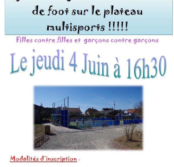 Le jeudi 4 juin le Conseil Municipal des Jeunes (CMJ) organise un tournoi de foot sur le nouveau plateau multisports qui vient d’être construit dans le parc de l’école. Le tournoi est réservé aux enfants âgés de 8 à 12 ans, en équipes de 5 ou 6 personnes. Les enfants intéressés doivent s’inscrire en Mairie …
