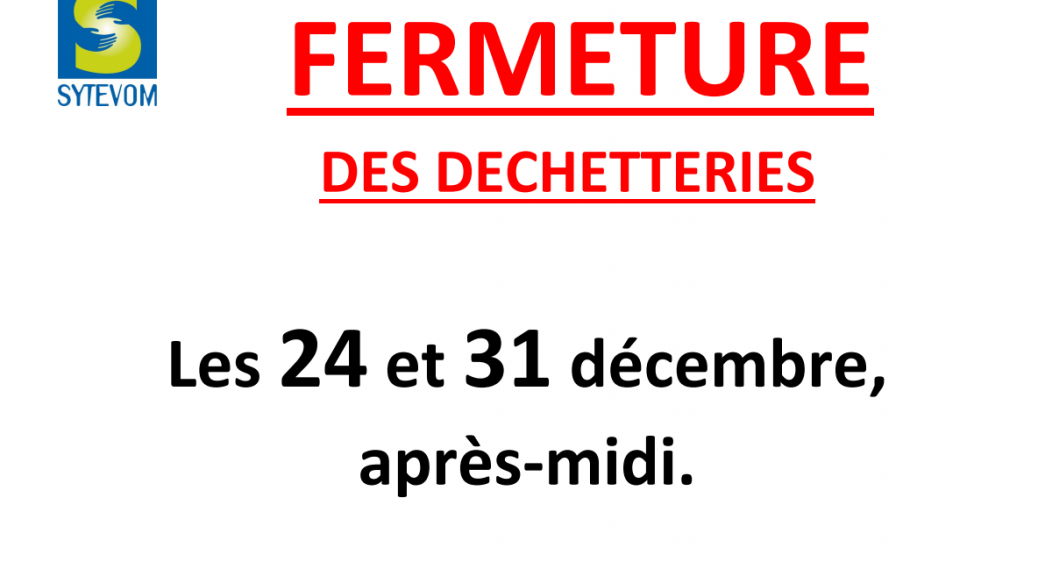 Avec les fêtes de fin d’année pensez à anticiper les fermeture de la déchetterie les 24 et 31 décembre pour l’après-midi.