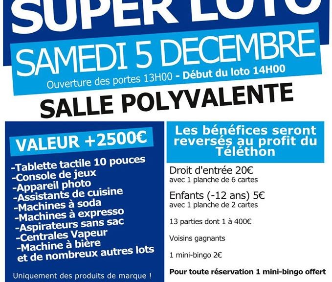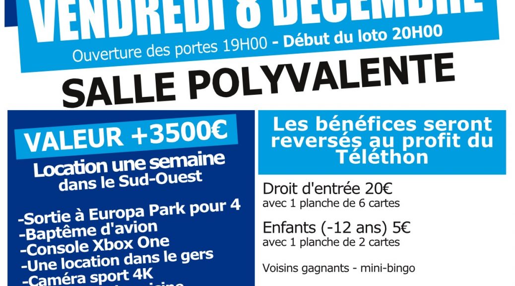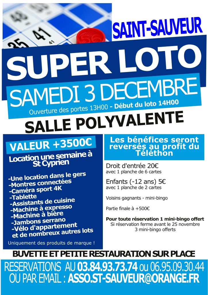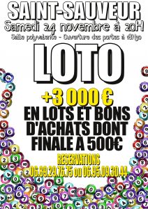 Dans le cadre du Téléthon un loto sera organisé le Samedi 5 décembre 2015 à 14h à la salle polyvalente de Saint-Sauveur. Loto en 13 parties, dont 1 mini-bingo. +2500€ de lots dont 1 partie à +400€ Prix : – 20€ pour les adultes (6 planches) – 5€ pour les enfants (2 planches) – 2€ …
