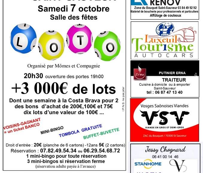 L’association des parents d’élèves de l’école de Saint-Sauveur, « Mômes et compagnie« , organise le samedi 10 octobre son premier Super Loto à Saint-Sauveur dans la salle polyvalente. Vous pourrez venir dans la salle à partir de 19 h pour un début du loto à 20 h 30. Tarif : 20€ les 6 cartons. Pour enfant moins …