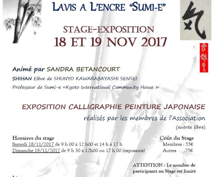 Un stage de sumi-e (lavis à l’encre) et une exposition seront organisés à la Maison des Associations les 18 et 19 novembre. L’associations « Art et Culture Japonais » vous propose de découvrir l’art de la calligraphie japonaise en organisant ce stage. Renseignements et inscriptions : 03.84.40.68.80 Email : artjapon@yahoo.fr Site http://www.artjapon.org