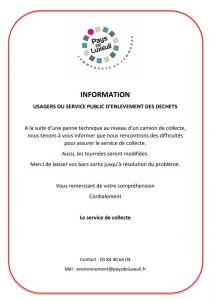 Les services techniques de la CCPLX en charge de la collecte des ordures ménagères rencontrent actuellement des problèmes avec l’un des véhicules. De ce fait le service de collecte se trouve fortement perturbé et s’adapte au jour le jour aux contraintes. En attendant de pouvoir utiliser à nouveau l’ensemble du matériel de tournée, de nouveaux …